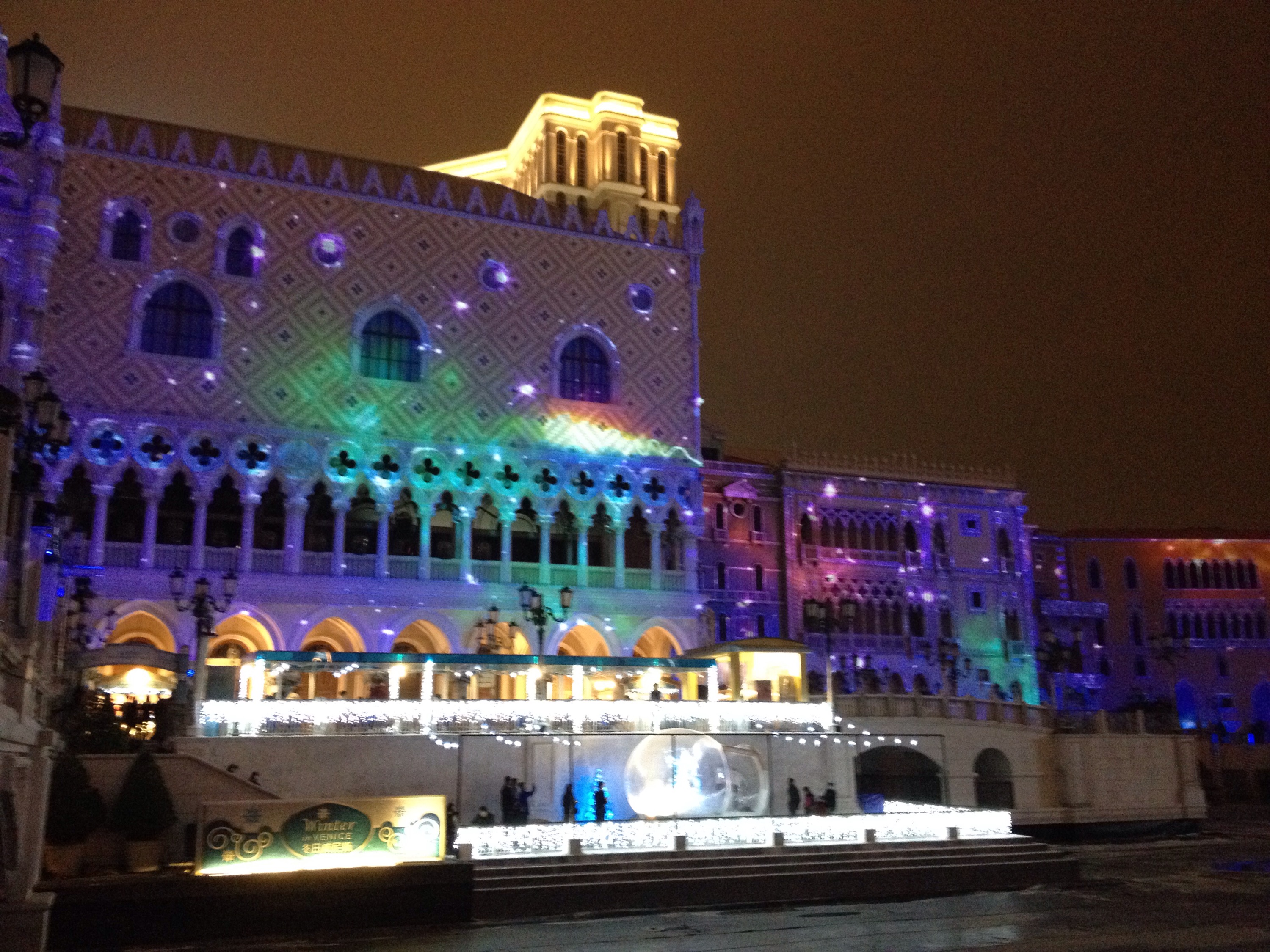 The Venetian itself is like something out of a Disney film, cartoon outlines included. Dazzling lights, fake snow and a host of Christmas-related street performers occupy the scene, set around a pedestrian bridge above a disused car park, otherwise meant to be the ‘lagoon’ (a substantial leak means all of the water has disappeared).